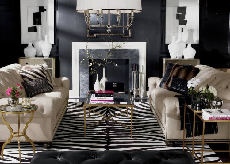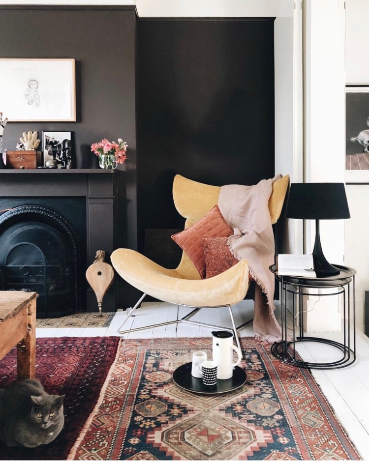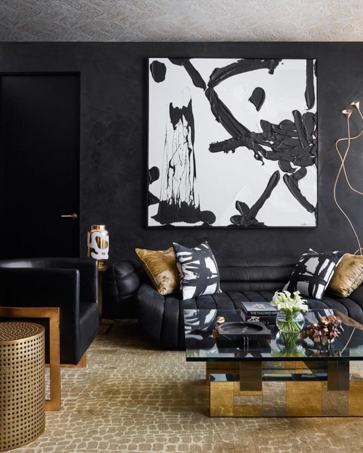 Per nje ekzekutim te mire te dizajnit te hapsires ne te cilen dominon njyra e erret triku eshte qe te bejme ndarje te hapsires te lyer me te erret me sa me shume materiale dhe tekstura te ndryshme. Tepihu punedore me theke p.sh, pastaje jastek dekorative me teksture, korniza te bukura, tavolina nga materialet natyrore, pastaj vazo dhe abazhur dekorativ etj, do e bejne qe ngjyra e erret te mos predominoj por e bejn qe kjo ngjyre te duket e sofistikuar, dramatike.