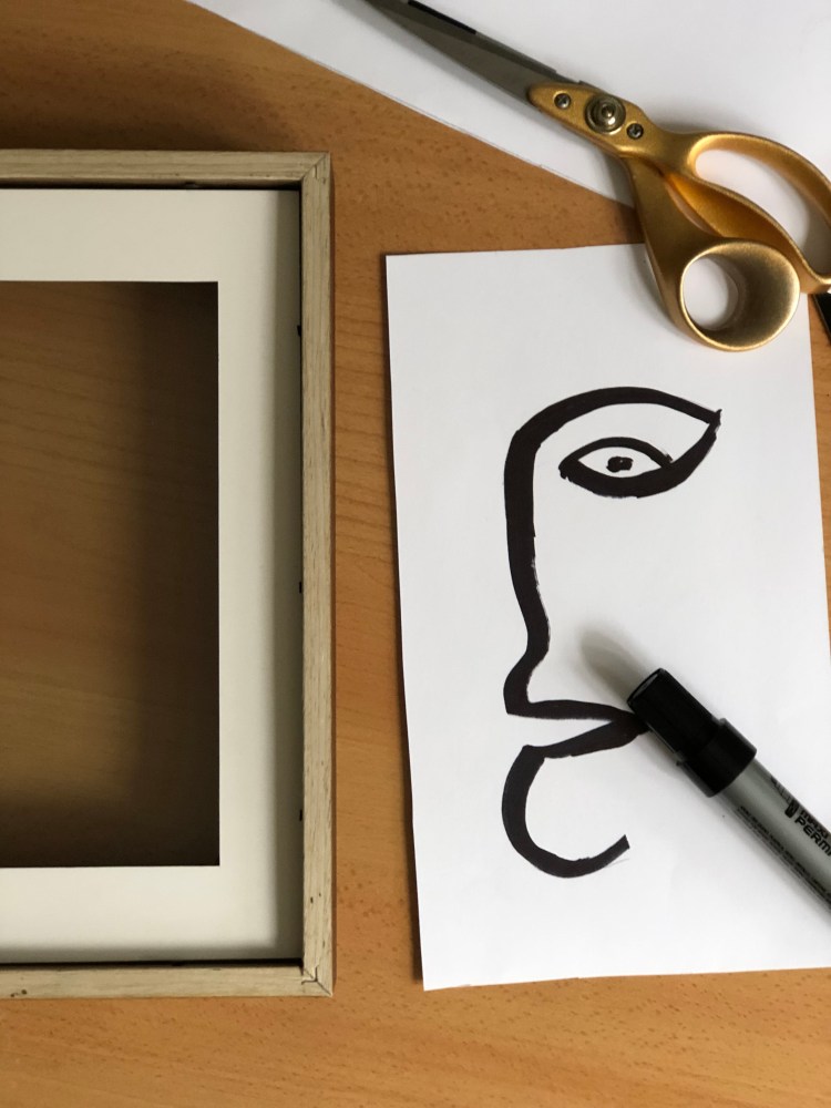 As I am not a line artist, I had to first draw one line face profile with a pencil, and afterwards using a permanent marker followed a pencil mark and ended up with a face profile and an eye. I inserted the drawings in wooden frames, and placed them in my studio space.