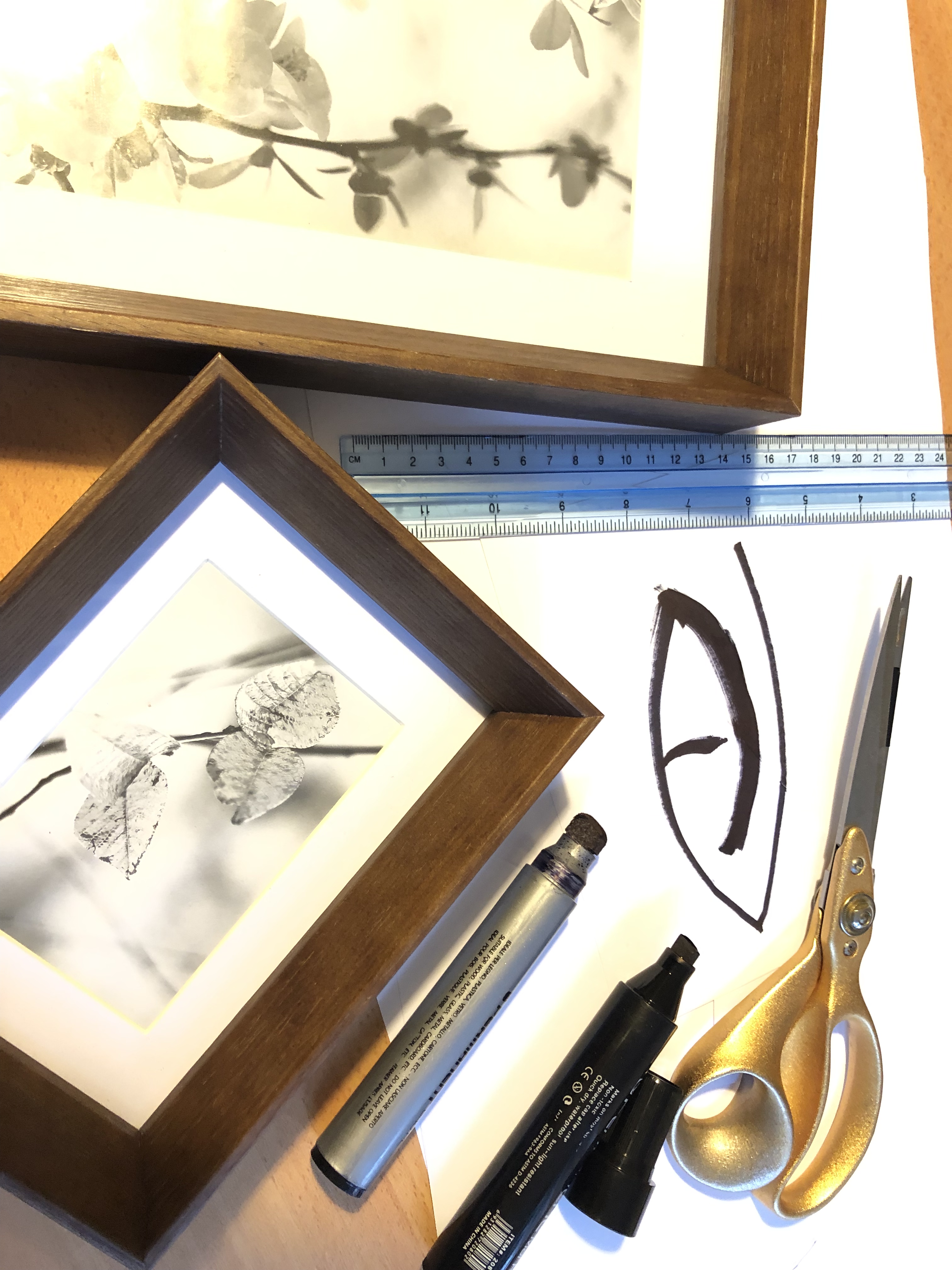 As I am not a line artist, I had to first draw one line face profile with a pencil, and afterwards using a permanent marker followed a pencil mark and ended up with a face profile and an eye. I inserted the drawings in wooden frames, and placed them in my studio space.