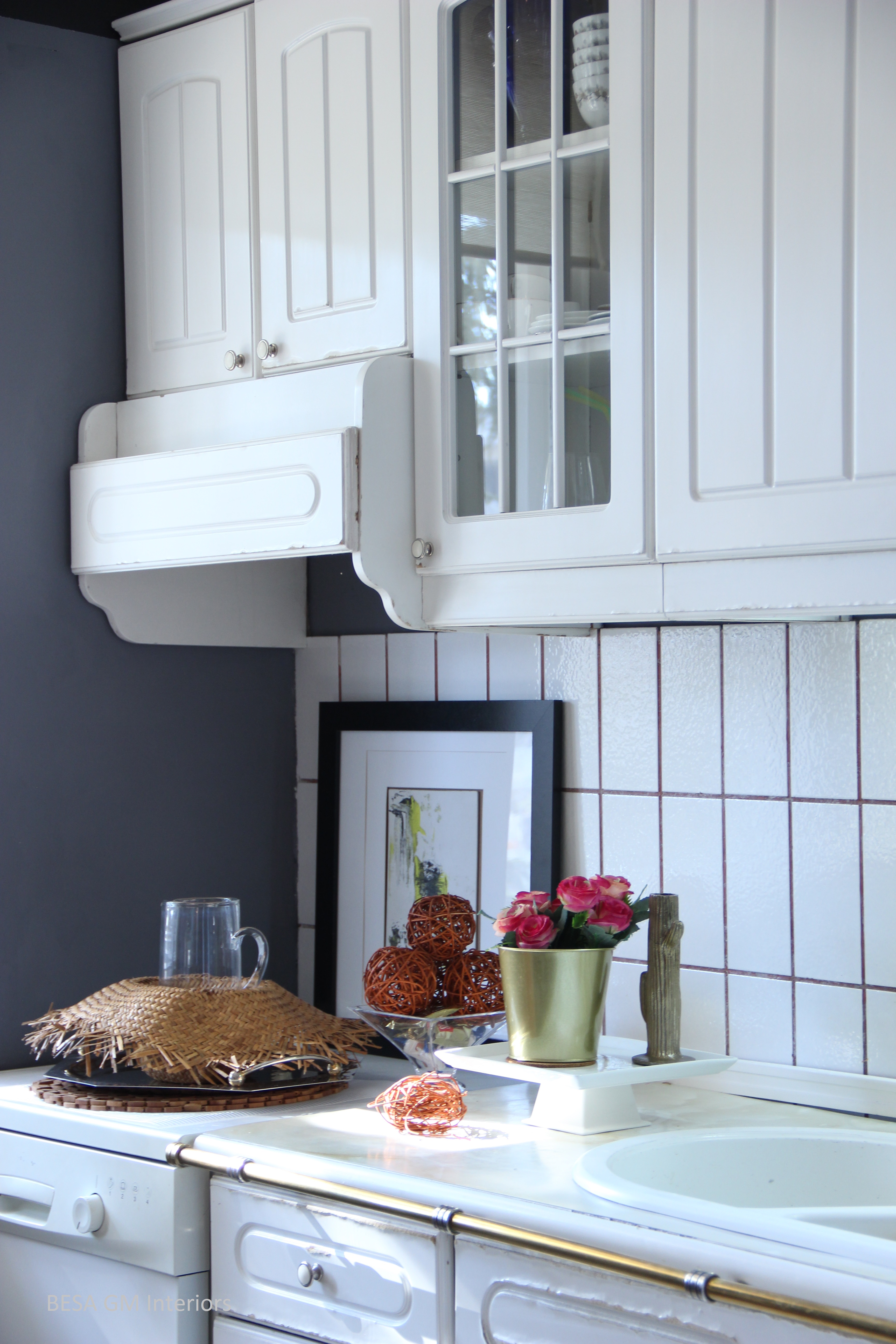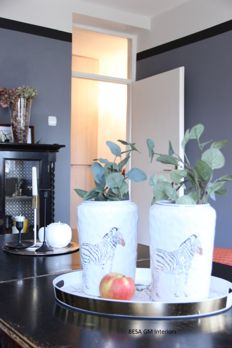 When working with dark colours in an interior another thing to consider is the CONTRAST that can be infused with different finishes, textures, accessories with interesting forms, as well as with pops of colour. White zebra vases placed in a faux marble tray with a gold finish edge, some faux and real apples, as well as the pops of colour using greenery and decorative pillows are used as the contrast in this makeover.