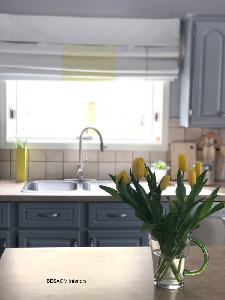 For the kitchen window I also designed and sewed a curtain panel which I attached it to the existing roman shade and it functions perfectly and looks so crisp and stylish. The white fabric used for this project is high quality cotton with black out backing. The middle yellow stripe is a fabric that is sewn on top of the white one and it really makes this roman shade so special and unique.