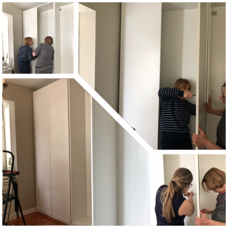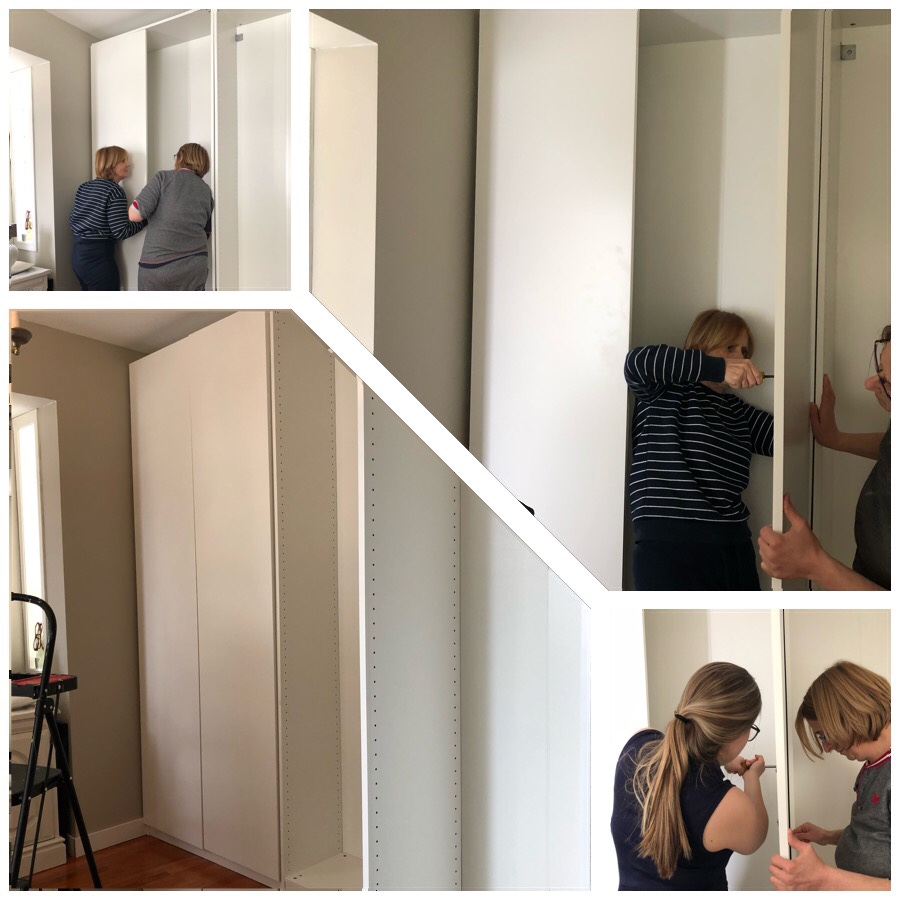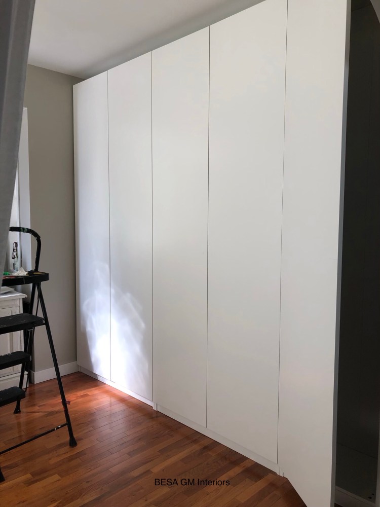 To enhance the storage space we purchased and assembled the IKEA PAX wardrobe frames (35 cmm wide) and used FORSAND doors which luckily were on sale for $50 including the soft closing hinges.