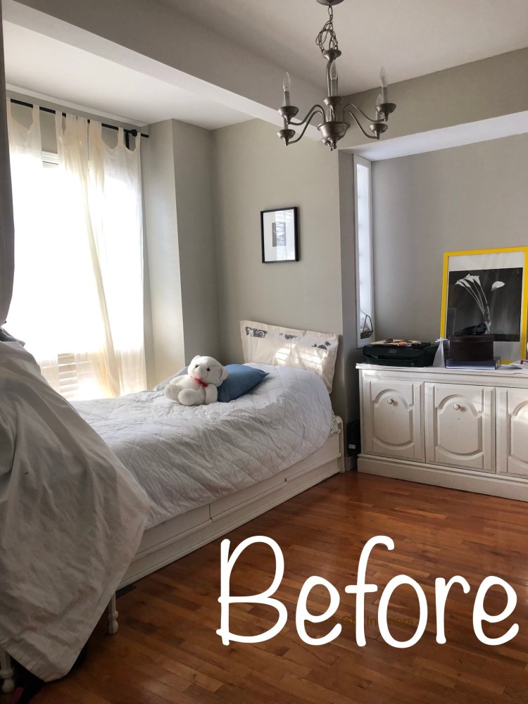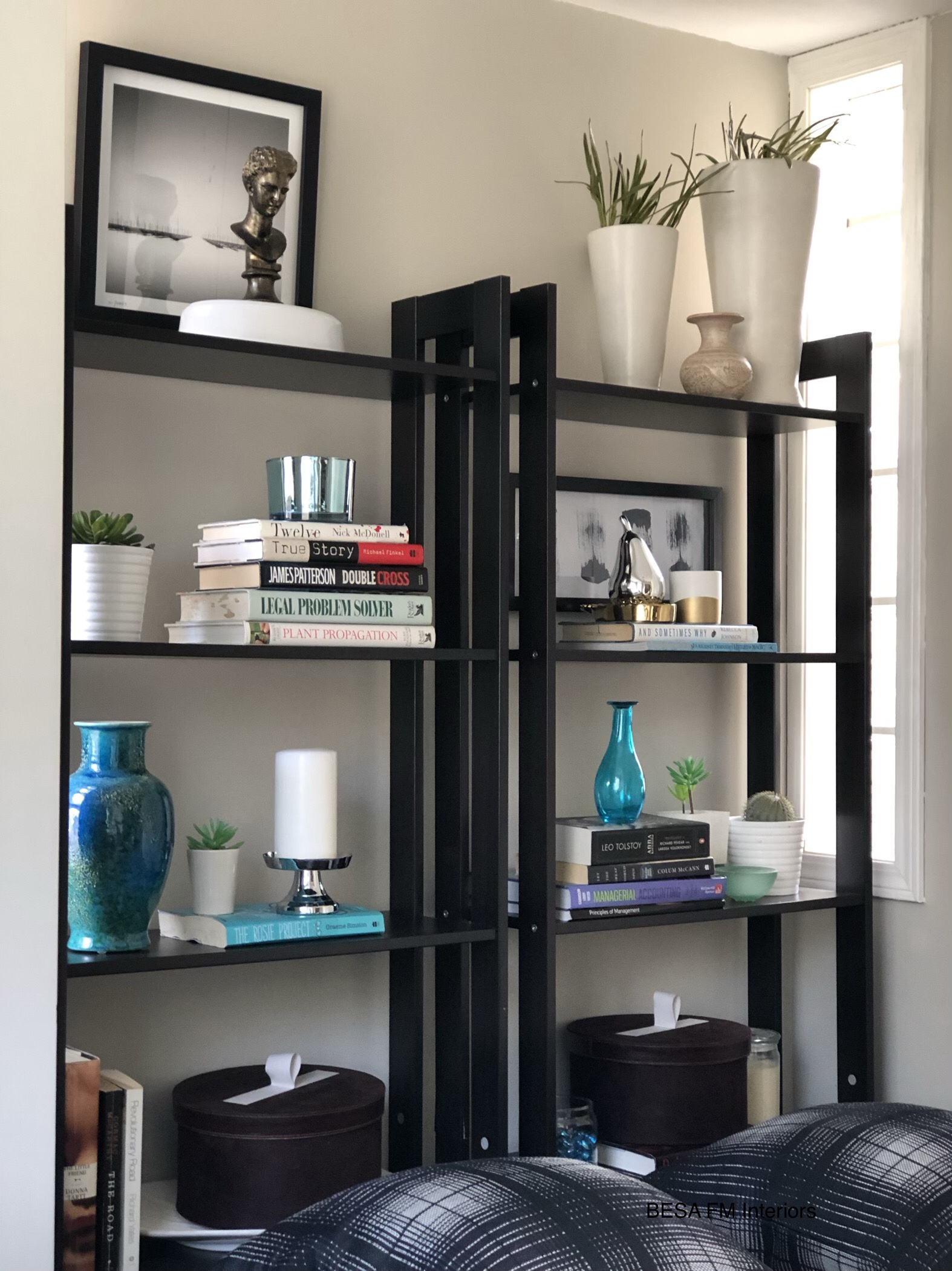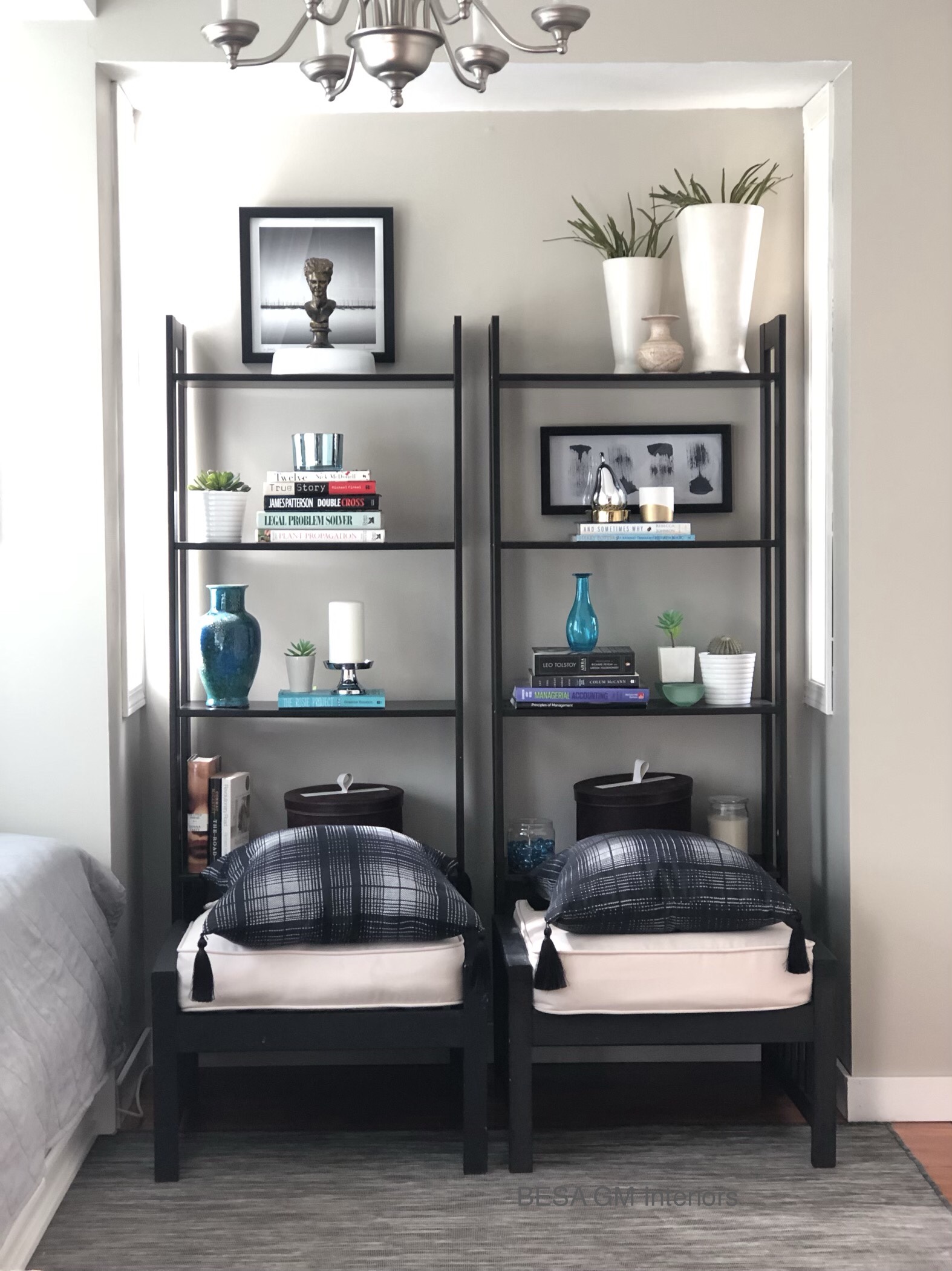 To provide a space for storing books and souvenirs within this small room I added a set of shelving which the family already owned and they were sitting unused in the basement. In front of these shelves I placed two existing stools which I “topped” them with stylish tassel pillows from @besahomeaccessories. Beside providing extra seating space, these stools also added a ton of style, and make this room such a neat looking space.