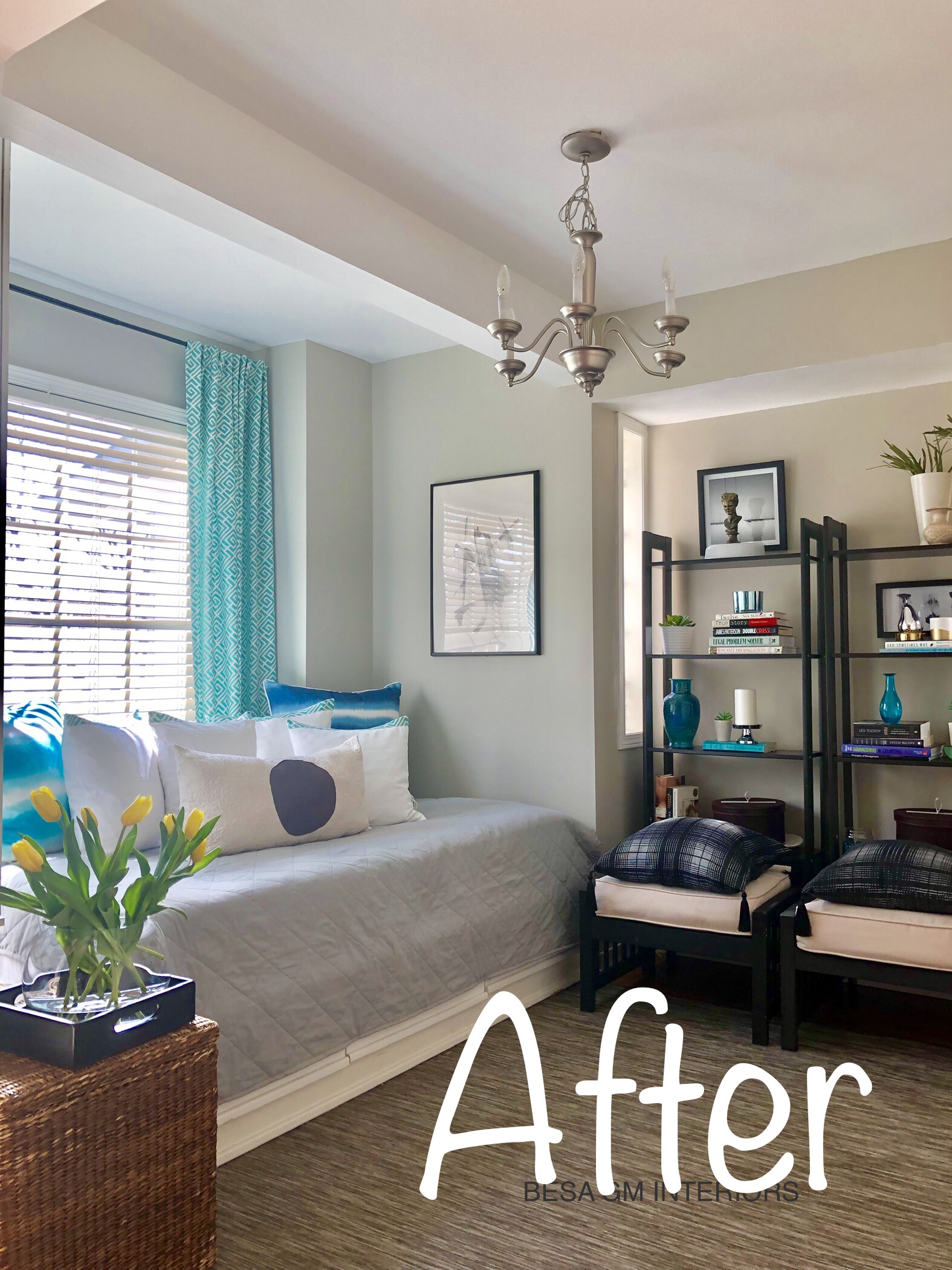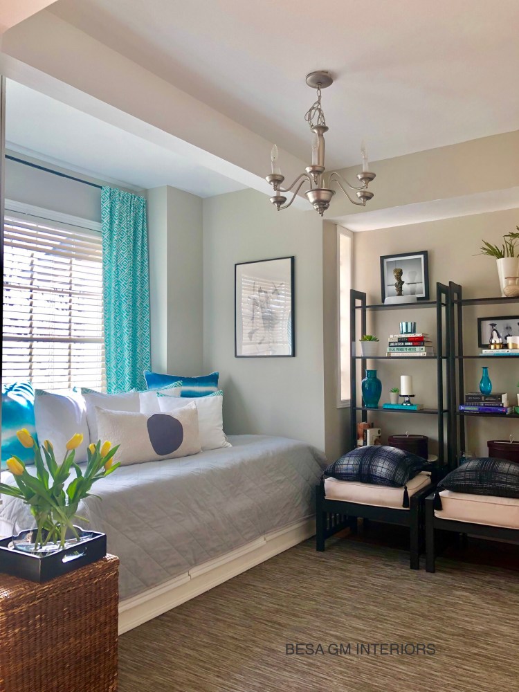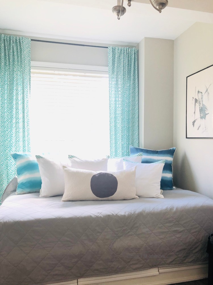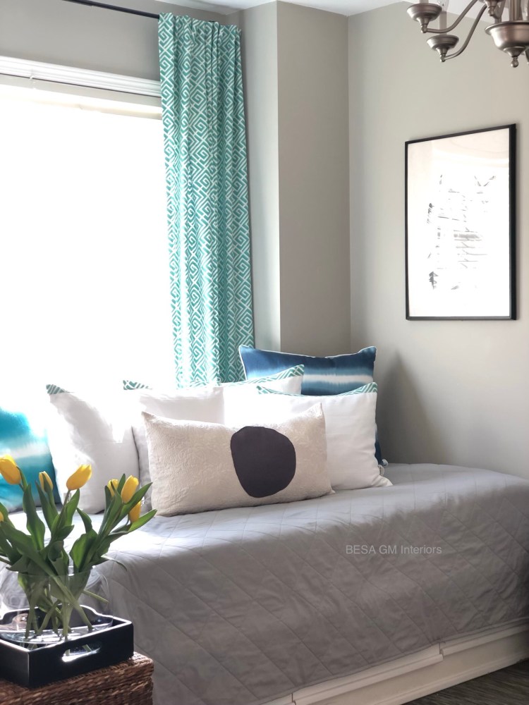 To add a splash of colour I purchased 6 meters of quality drapery fabric in turquoise colour, and custom made two panels which now grace this beautiful window against the daybed.