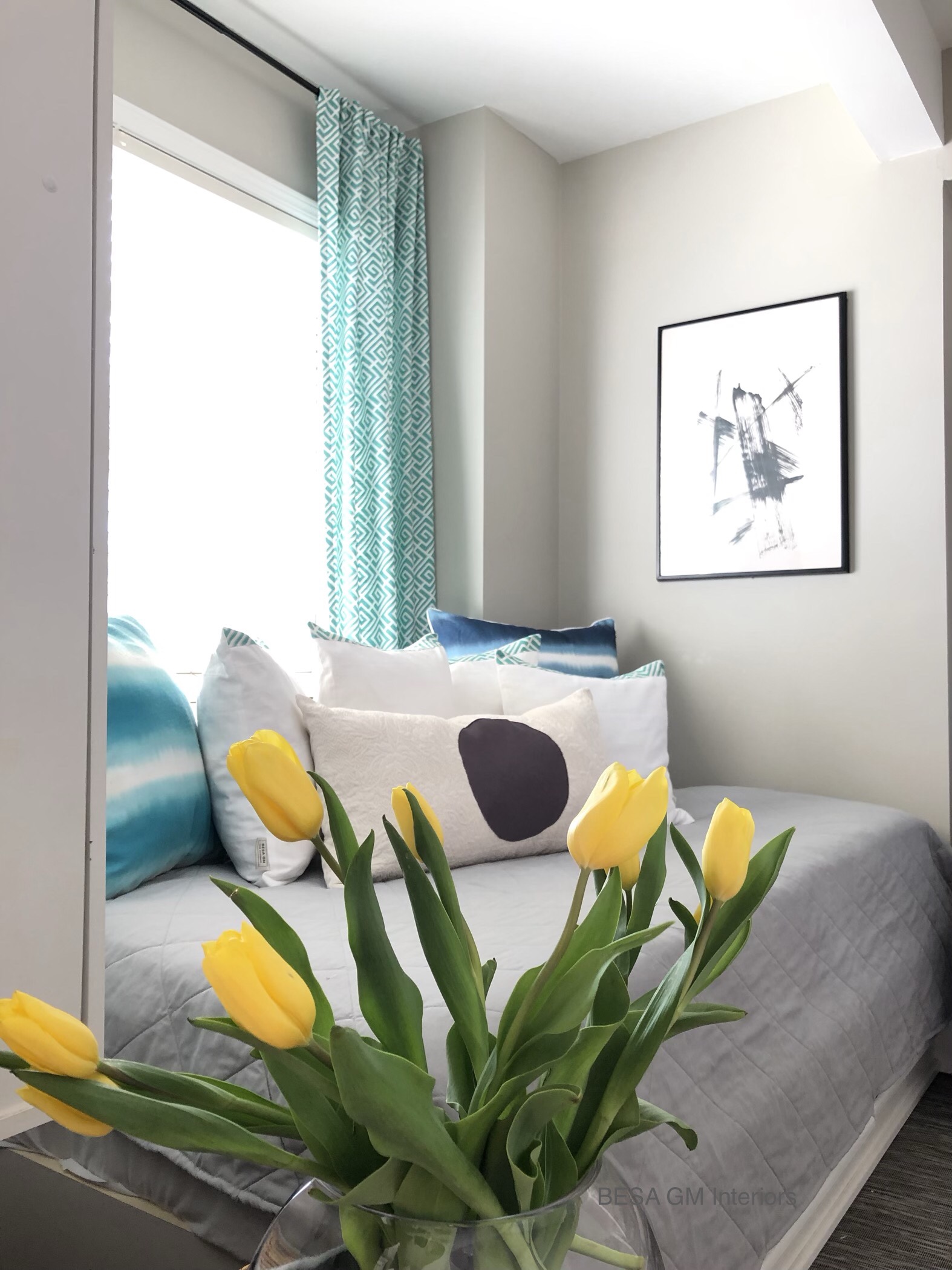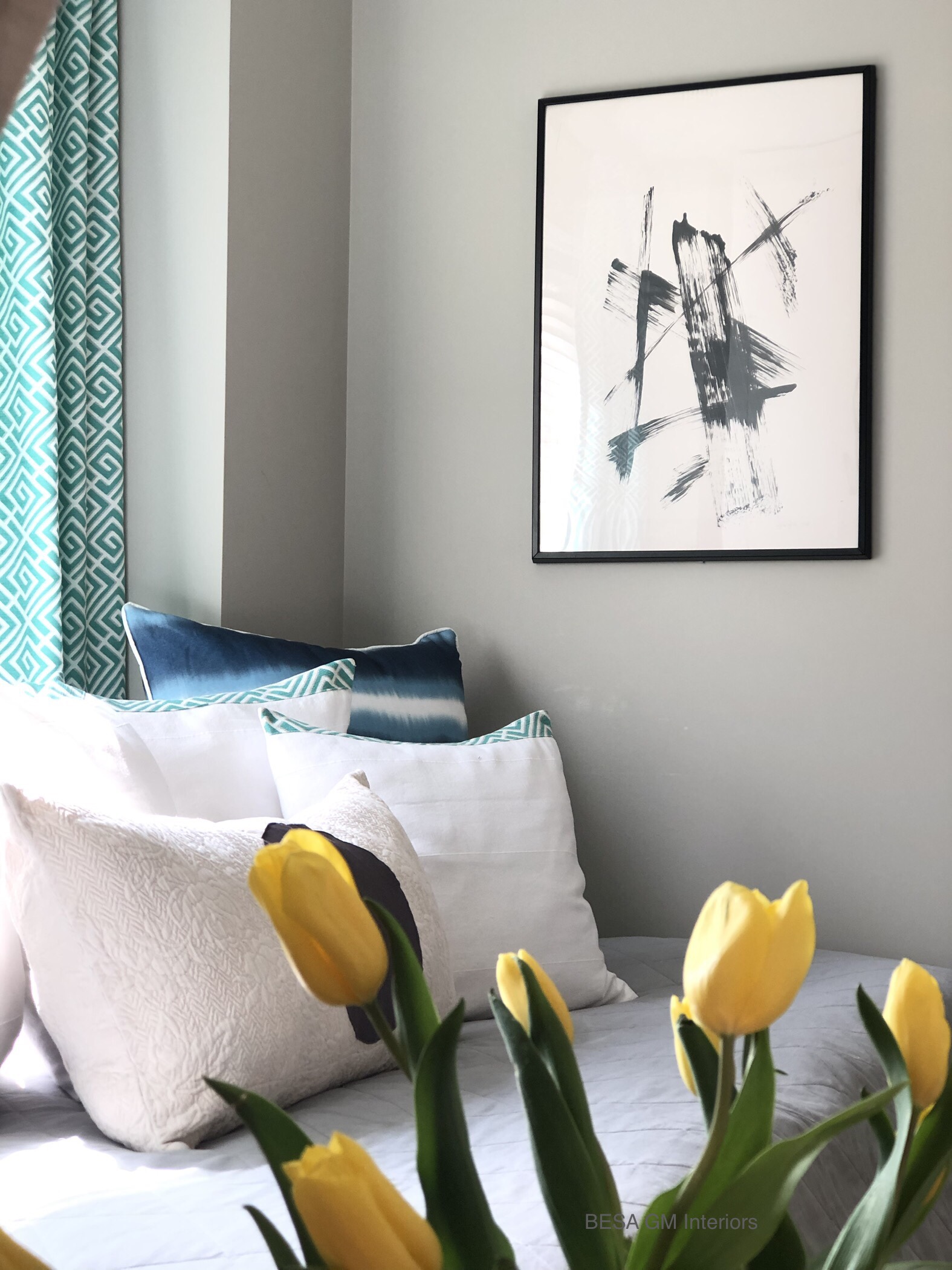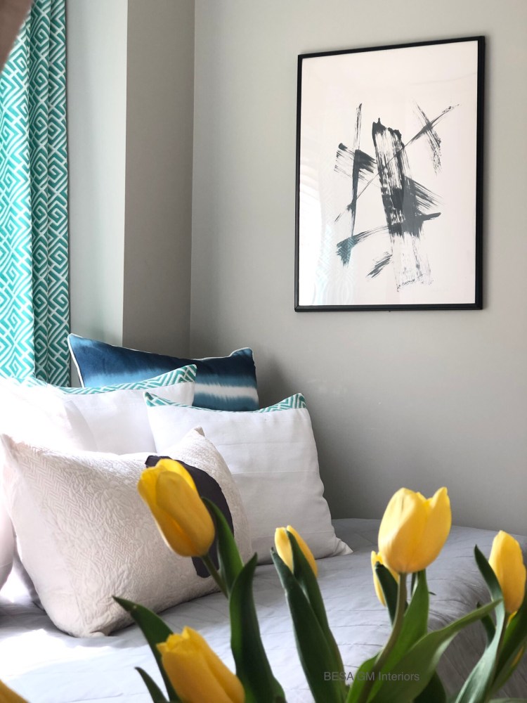 To add a splash of colour I purchased 6 meters of quality drapery fabric in turquoise colour, and custom made two panels which now grace this beautiful window against the daybed.