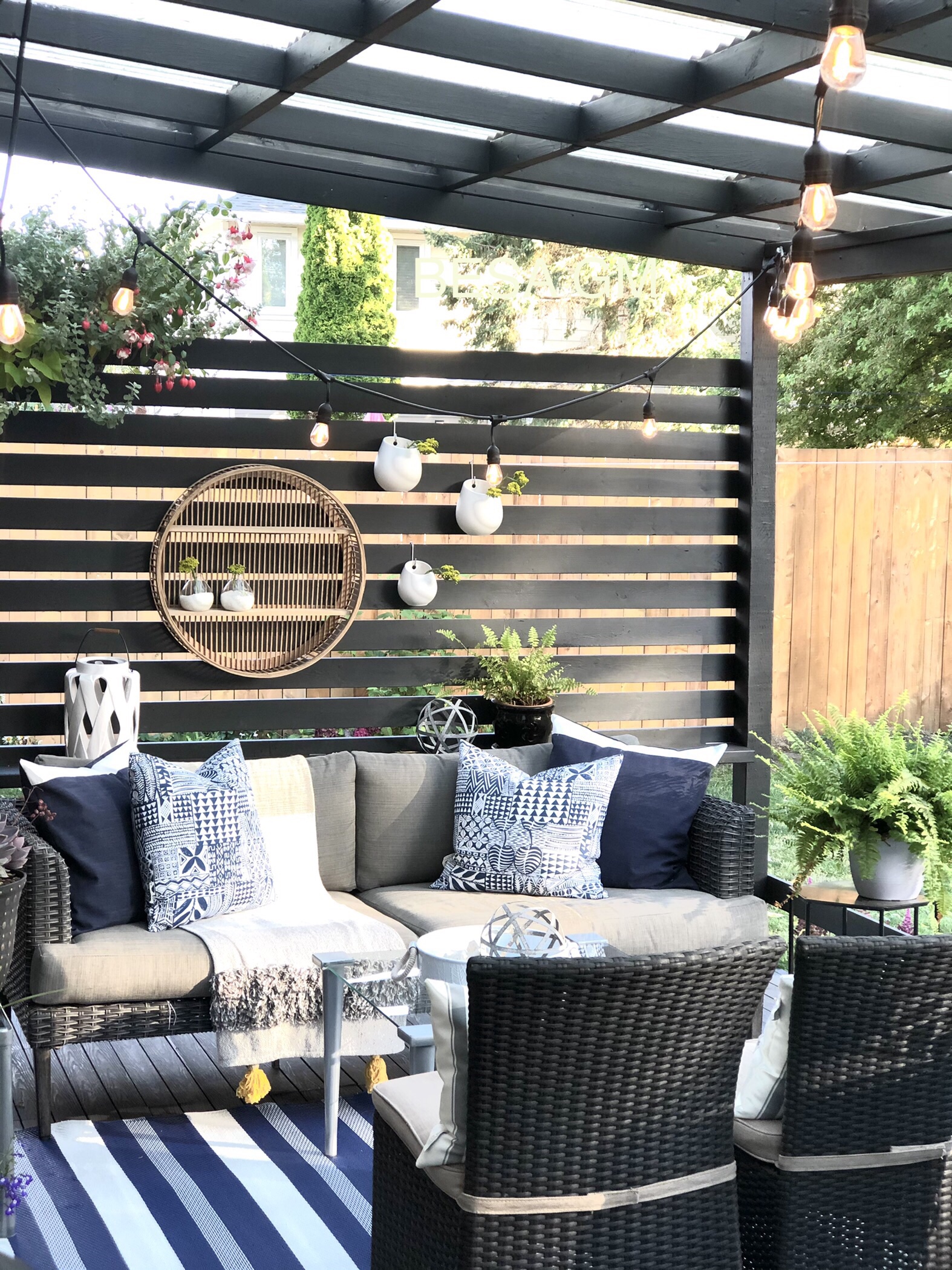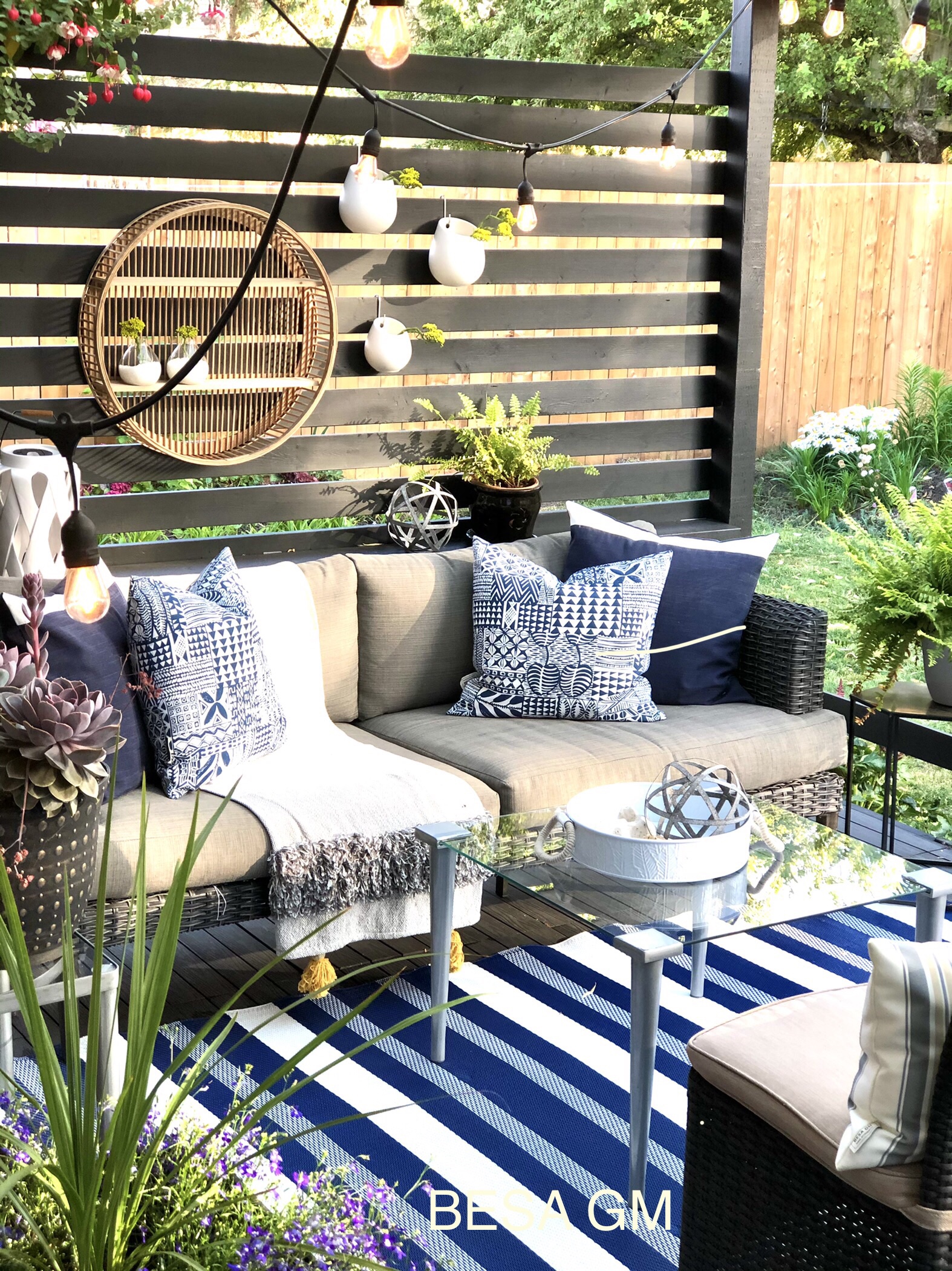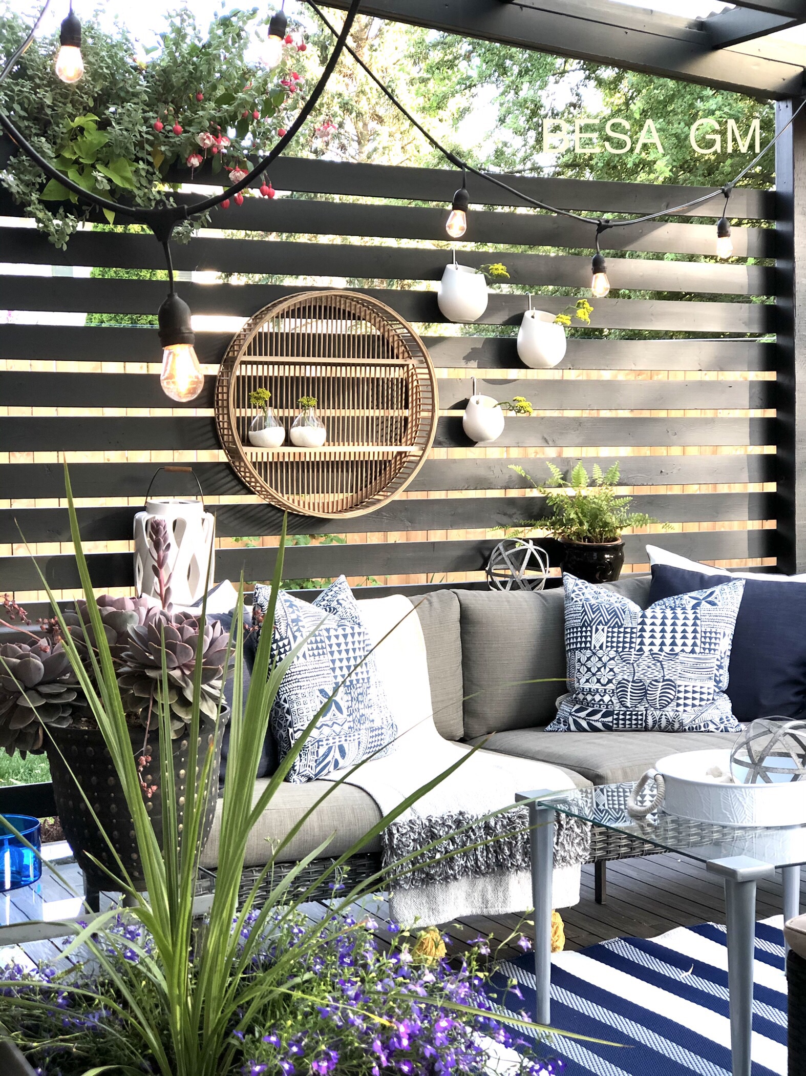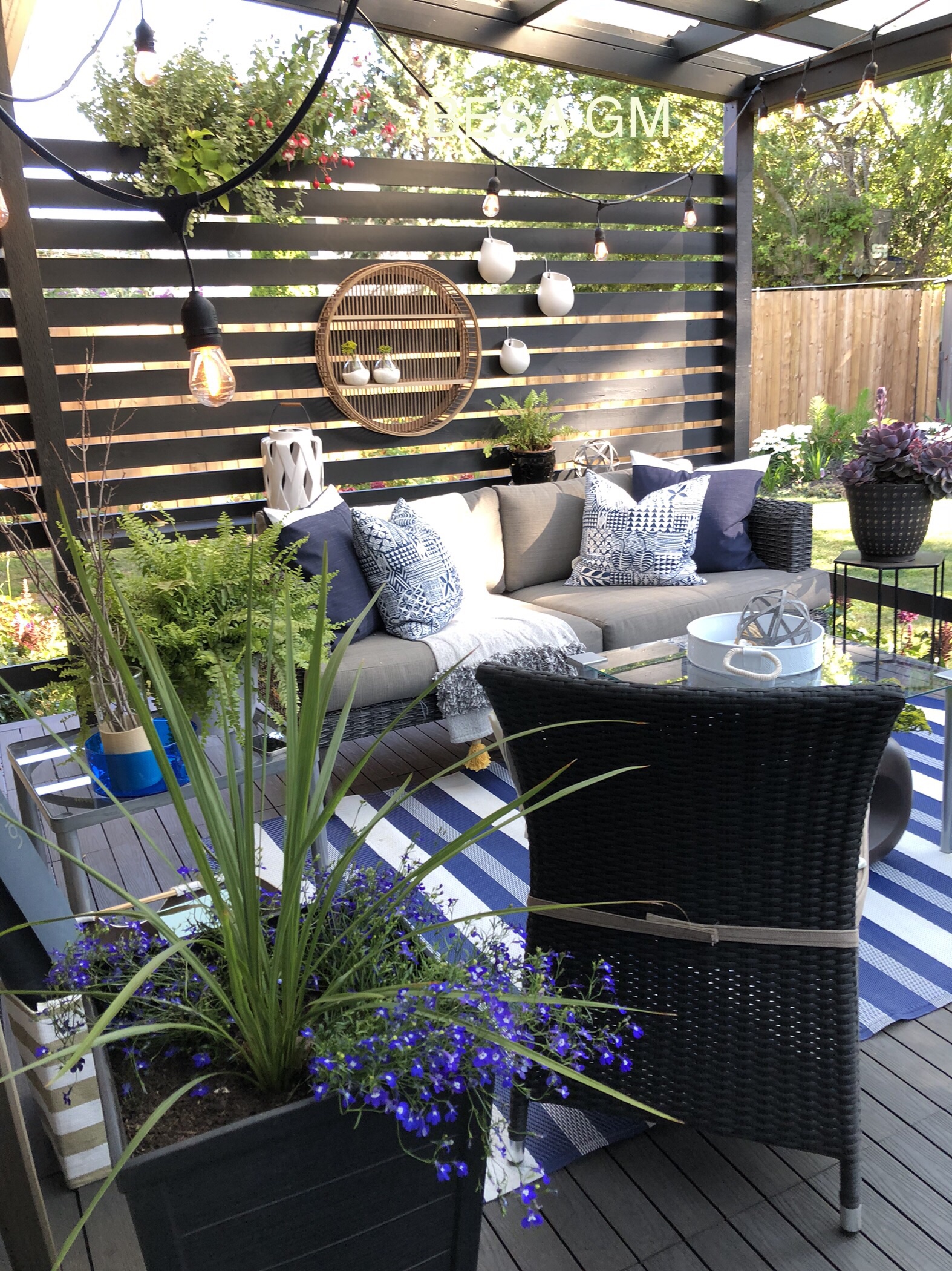 Everything has been DIY ed here as, due to the lockdown restrictions, we could not get professional help or materials that we needed or wanted. Some purchases were made online such as the deck composite tiles at Lowe’s and Canvas outdoor sofa at Canadian Tire. The outdoor rug and the string lights were purchased at Costco during our grocery shopping and sofa pillows were DIY-ed.