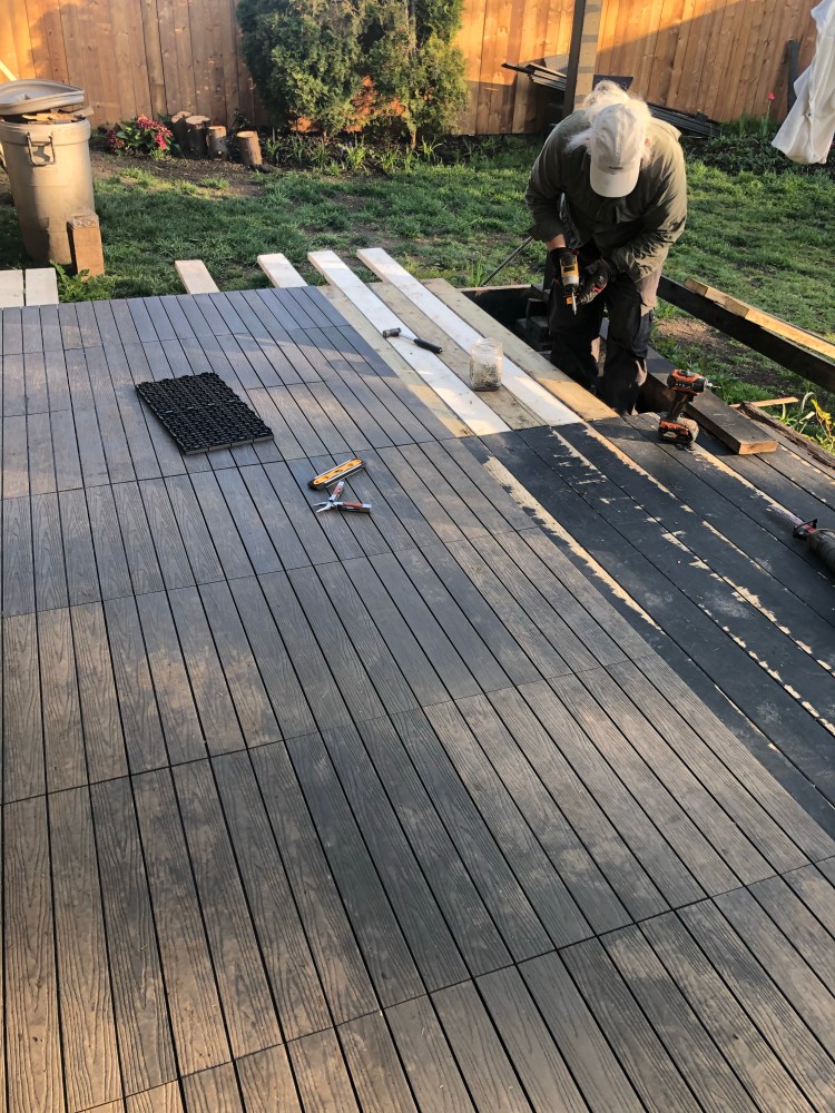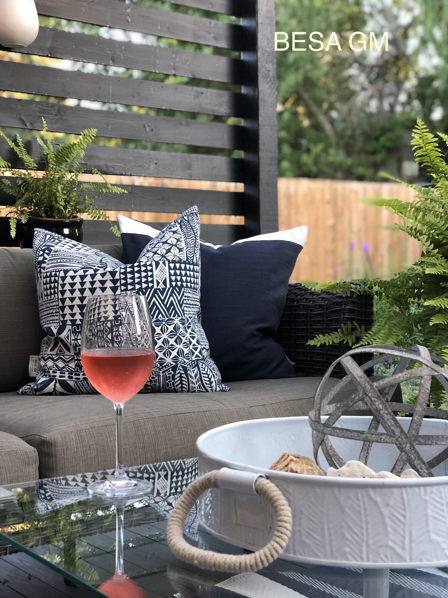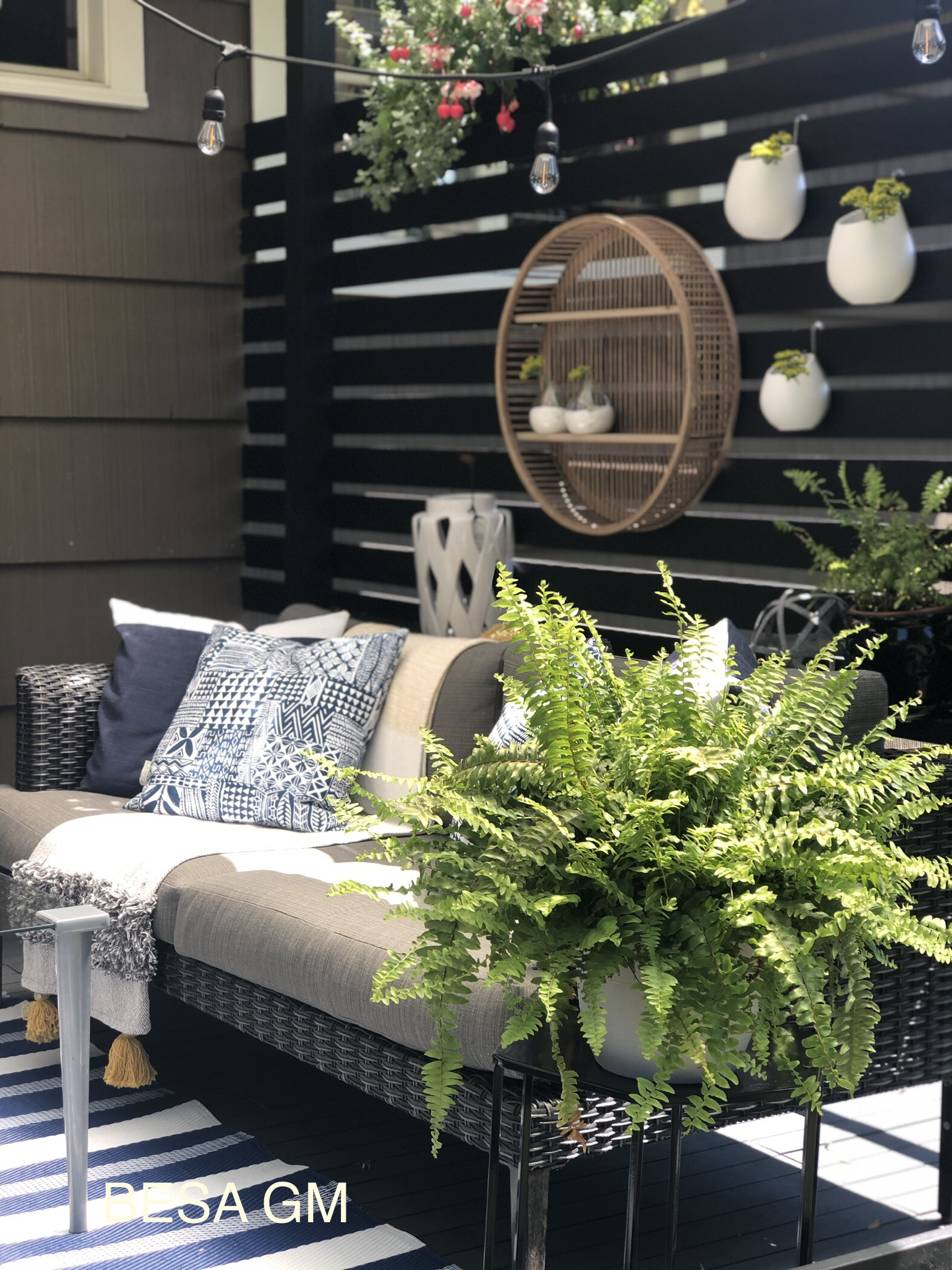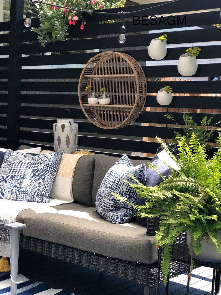 Everything has been DIY ed here as, due to the lockdown restrictions, we could not get professional help or materials that we needed or wanted. Some purchases were made online such as the deck composite tiles at Lowe’s and Canvas outdoor sofa at Canadian Tire. The outdoor rug and the string lights were purchased at Costco during our grocery shopping and sofa pillows were DIY-ed.